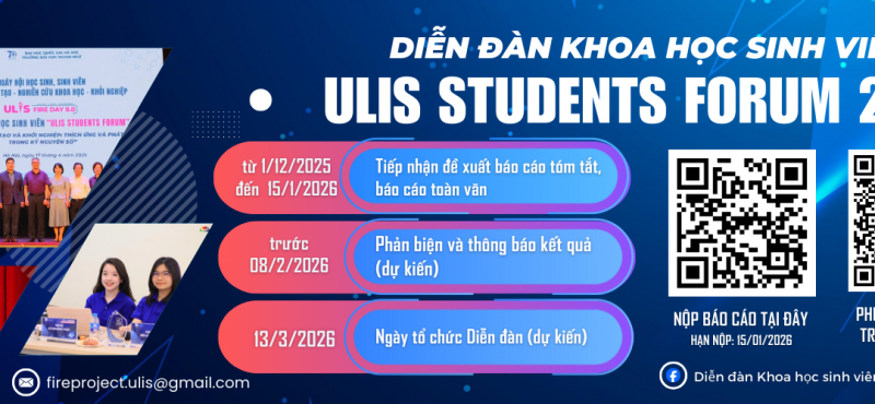 UI NEWS THÔNG BÁO SỐ 1: Thông báo mời viết bài, tham gia Diễn đàn Khoa học sinh viên “ULIS Sutudents Forum” 2026 với chủ đề “Sinh viên với khoa học công nghệ, đổi mới sáng tạo và chuyển đổi số” THÔNG BÁO LỊCH TRÌNH NGHIỆM THU ĐỀ TÀI NCKH, DỰ ÁN ĐMST, KN SINH VIÊN CẤP TRƯỜNG ĐỢT 4/2025 Đội thi ULIS được vinh danh Giải Bình chọn “POSTER KHOA HỌC ĐƯỢC YÊU THÍCH NHẤT” – Giải thưởng Nghiên cứu khoa học EURÉKA 2025 Cuộc thi “3000+ SÁNG KIẾN” chính thức khởi động ULIS FIRE Journal Vol. 17 chính thức phát hành Ngày hội ULIS FIRE Day 8.0 và Diễn đàn Khoa học sinh viên 2025 – “Ngôn ngữ, Sáng tạo và khởi nghiệp: Thích ứng và phát triển trong kỷ nguyên số” Thông báo số 2: Diễn đàn Khoa học sinh viên ULIS Student Forum 2025 Văn bản - Biểu mẫu Sự kiện sắp diễn ra THÔNG BÁO SỐ 1: Thông báo mời viết bài, tham gia Diễn đàn Khoa học sinh viên “ULIS Sutudents Forum” 2026 với chủ đề “Sinh viên với khoa học công nghệ, đổi mới sáng tạo và chuyển đổi số” THÔNG BÁO LỊCH TRÌNH NGHIỆM THU ĐỀ TÀI NCKH, DỰ ÁN ĐMST, KN SINH VIÊN CẤP TRƯỜNG ĐỢT 4/2025 Cuộc thi “3000+ SÁNG KIẾN” chính thức khởi động ULIS Fire journal UI – NEWs | Ấn phẩm ULIS FIRE Journal Vol 12 ULIS FIRE JOURNAL Vol.11 ULIS FIRE JOURNAL Vol.10 🔥 ULIS FIRE Journal Vol9 UI AWARD “Song Hạnh” | NGUYỄN HỒNG HẠNH VÀ NGUYỄN PHƯƠNG HẠNH – 02 ULISER xuất sắc nhận thưởng tổng trị giá 50.000.000 VNĐ cho bài báo khoa học được công bố quốc tế Hoàng Vân Linh – Niềm đam mê NCKH được thắp lên qua một buổi tọa đàm Gặp gỡ Minh Tâm – Cô gái với niềm đam mê nghiên cứu khoa học không ngừng nghỉ Nguyễn Bảo Ngọc: “Khi bạn khao khát một điều gì, cả vũ trụ sẽ hợp lực giúp bạn đạt được điều đó” Quỹ thắp lửakhởi nghiệp sáng tạo Thông báo: Sơ kết Quỹ Thắp lửa khởi nghiệp đợt 1 năm 2024 (tháng 4/2024) Dự án“LĂNG KÍNH LỊCH SỬ” của nhóm sinh viên ULIS lọt vào Vòng Bán kết cuộc thi “DESIGN THINKING OPEN INNOVATION” Dự án cộng đồng “Mái tóc yêu thương” của học viên lớp Văn bằng 2 ULIS – từ bài tập nhóm môn học đến dự án cộng đồng đặc biệt và ý nghĩa UI NHẬT KÝ SÁNG TẠO | KHÔNG GIAN TRAO ĐỔI SÁCH TIẾNG ANH CŨ ( OLD BOOKS FOR ULISER) Các đơn vị đối tác