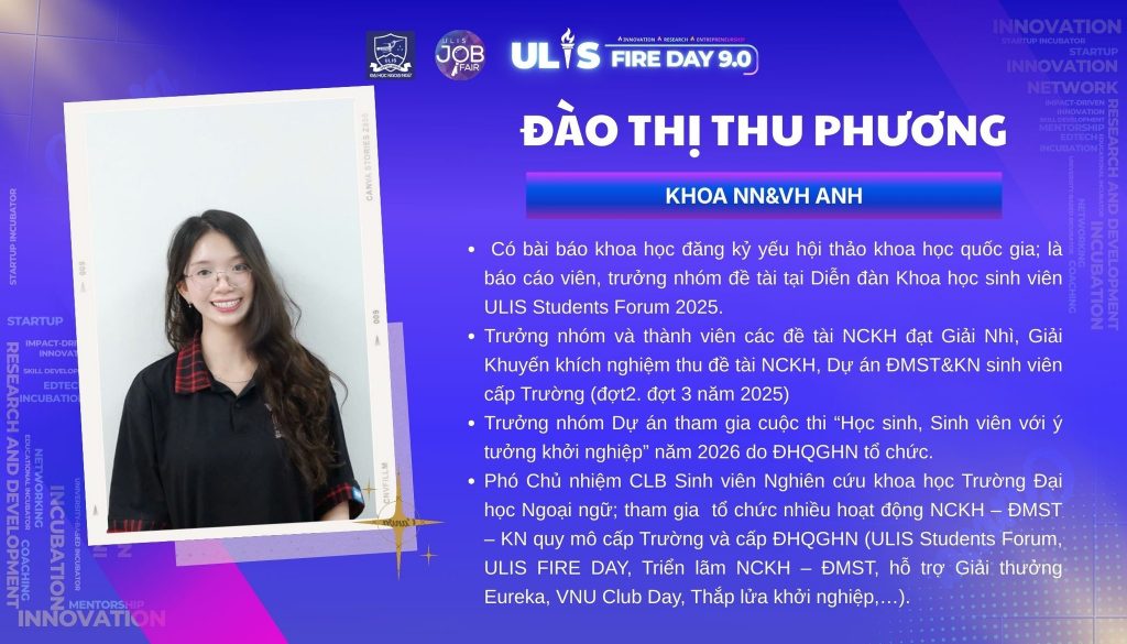Đào Thị Thu Phương là một trong những sinh viên tiêu biểu thể hiện tinh thần cầu tiến trong học tập và nghiên cứu tại Trường Đại học Ngoại ngữ – ĐHQGHN. Ba từ khóa “tò mò – kiên trì – chủ động” không chỉ là cách Phương giới thiệu bản thân, mà còn là định hướng xuyên suốt trong quá trình học tập và phát triển năng lực cá nhân.