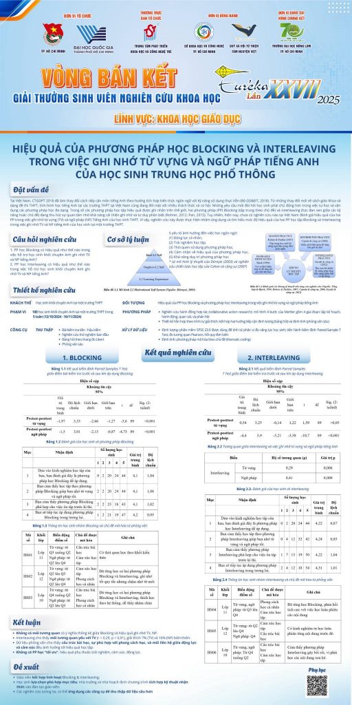 BTC Giải thưởng Sinh viên Nghiên cứu Khoa học Euréka lần thứ 27 vừa công bố danh sách các đề tài có poster nhận được nhiều lượt bình chọn nhất. Trong lĩnh vực Khoa học Giáo dục, nhóm nghiên cứu của Trường Đại học Ngoại ngữ gồm các sinh viên Phạm Đặng Gia Linh, Trần Phương Linh và Ngô Thị Ngọc Trâm, dưới sự hướng dẫn của Tiến sĩ Nguyễn Thị Minh Trâm, đã xuất sắc góp mặt với đề tài: “Hiệu quả của phương pháp học Blocking và Interleaving trong việc ghi nhớ từ vựng và ngữ pháp tiếng Anh của học sinh Trung học phổ thông”.