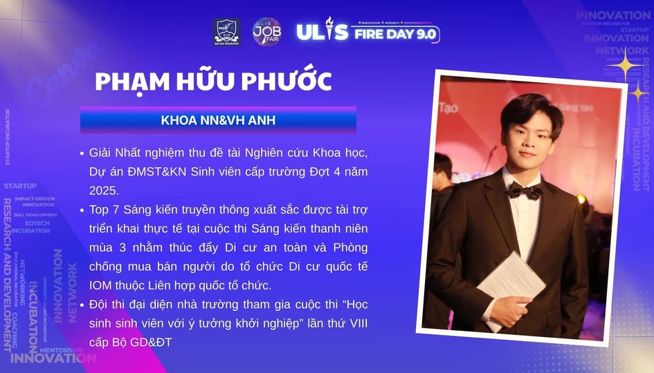 Phạm Hữu Phước là một trong những sinh viên tiêu biểu trong lĩnh vực Nghiên cứu khoa học, Đổi mới sáng tạo và Khởi nghiệp tại Trường Đại học Ngoại ngữ – ĐHQGHN. Với tinh thần chủ động và bản lĩnh dấn thân, Phước xem mỗi dự án không chỉ là nhiệm vụ học thuật mà còn là cơ hội để thử thách giới hạn bản thân và đóng góp những giải pháp có ý nghĩa đối với xã hội.